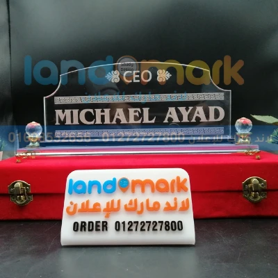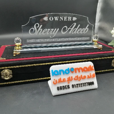 Meta Description: Glass Name Plate S99 ستاند اسم زجاجي فاخر، حفر ليزر أو طباعة بالألوان، قاعدة كريستال، وصندوق هدايا مخملي. اطلب الآن! 🚀