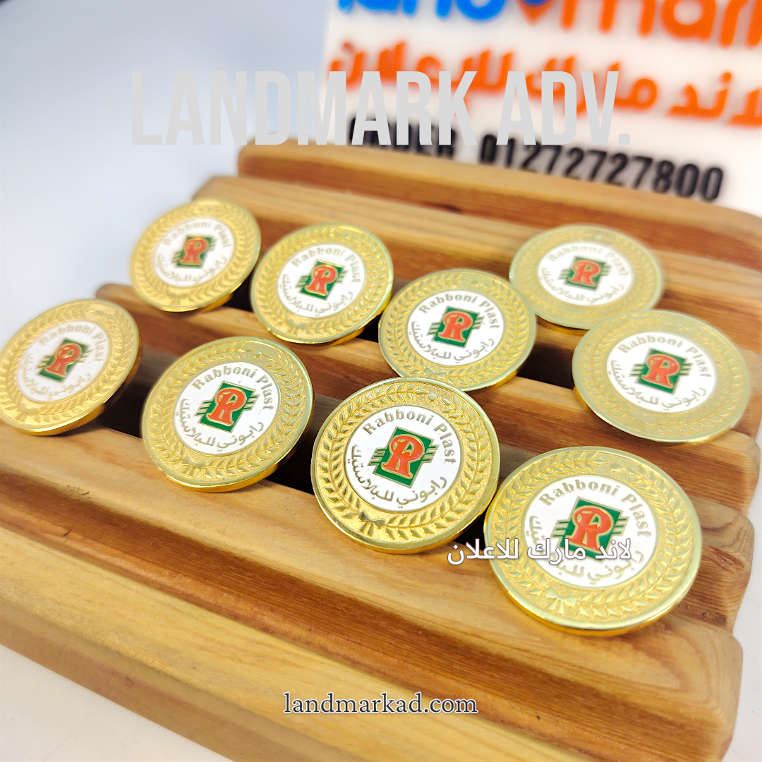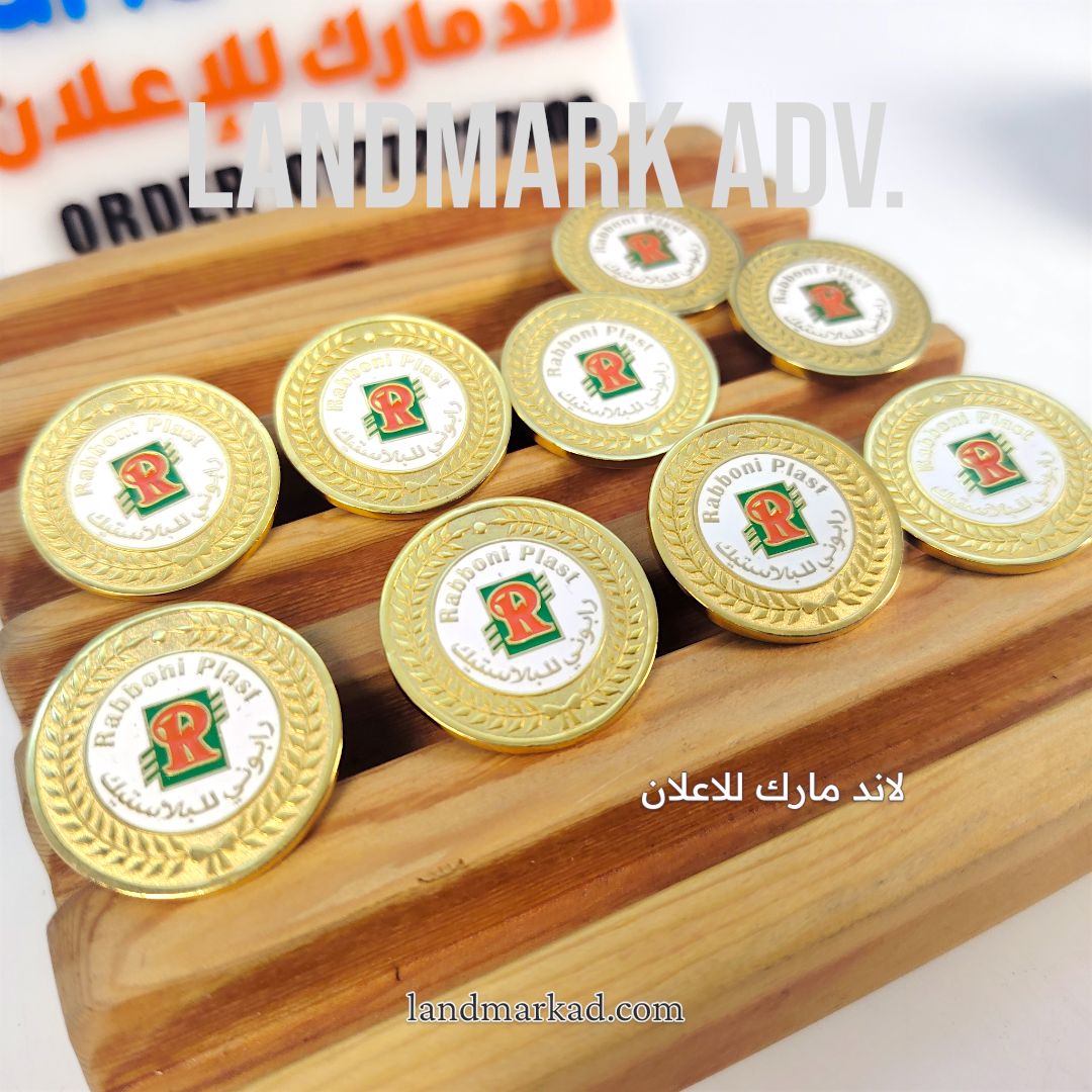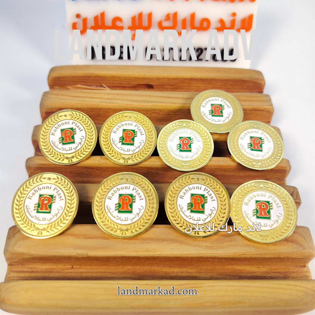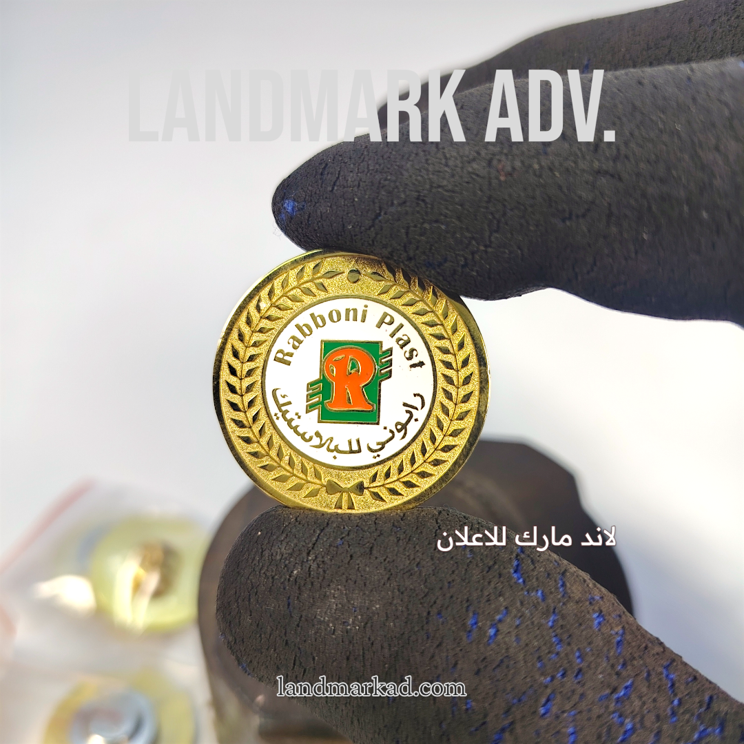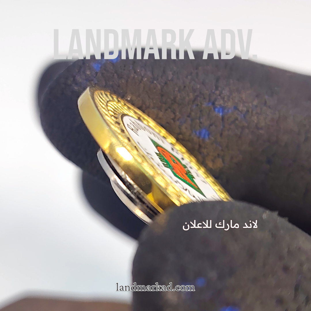 دبوس بدلة دائرى مع فريم ولوجو تلوين غاطس جايّلك بتفاصيل دقيقة وبfinish ناعم يخليك تكمّل ستايلك بثقة. الفريم غصن مطلي ماء دهب بيلمع بشكل رايق، وكمان اللوجو بيكون ملون وغاطس جوه المعدن علشان يدي عمق وفخامة أكتر.